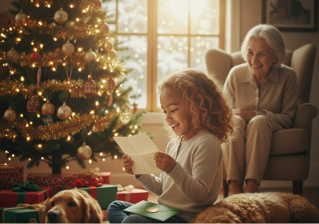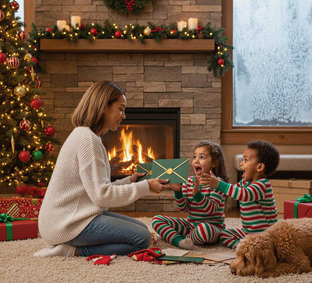 Printed on elegant linen paper and paired with a Christmas-green envelope trimmed in gold. The letter is delivered unsealed, with a satin ribbon and gold seal provided, giving you the chance to review every detail and seal the envelope by hand before gifting.